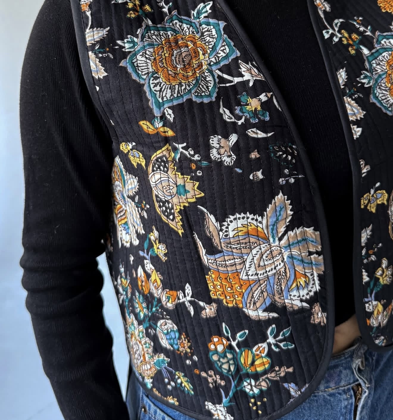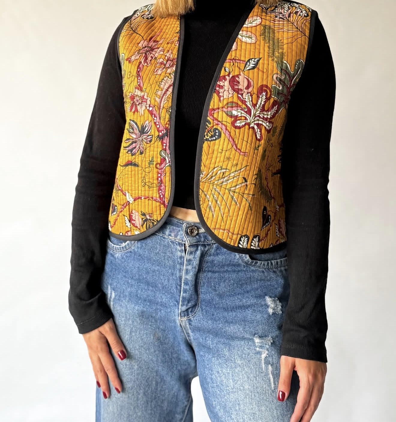 جلیقه پنبه دوزی دورو پارچه پنبه دوزی هندی مناسب سه فصل ( بهار ، پاییز ، زمستان ) دور سینه سایز کوچک ۹۸ س.م / قد : ۵۰ س.م دور سینه سایز بزرگ ۱۰۶ س.م / قد ۵۵ س.م